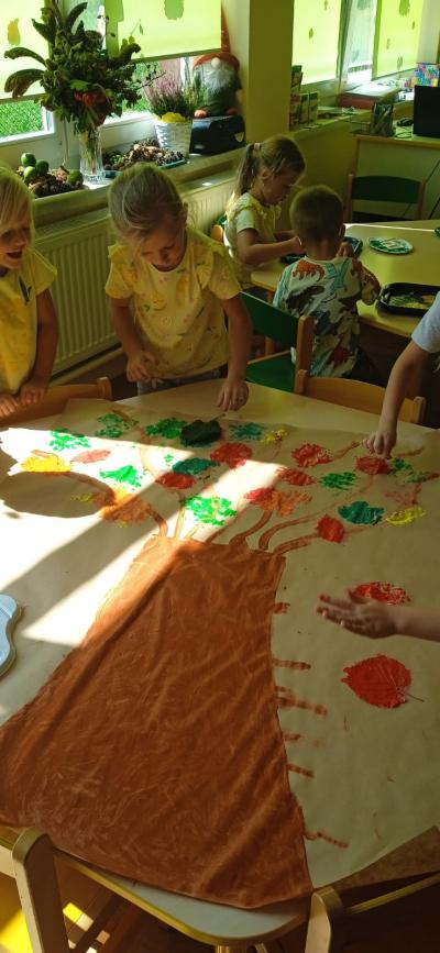 A skoro o sztuce mowa… Przedszkolaki zamieniły się w prawdziwych artystów! Wspólnie stworzyły piękne jesienne drzewo, używając do tego farb i… liści! Malowanie liści i odbijanie ich na papierze sprawiło dzieciom ogromną frajdę – a efekty ich pracy można podziwiać na naszej przedszkolnej tablicy.