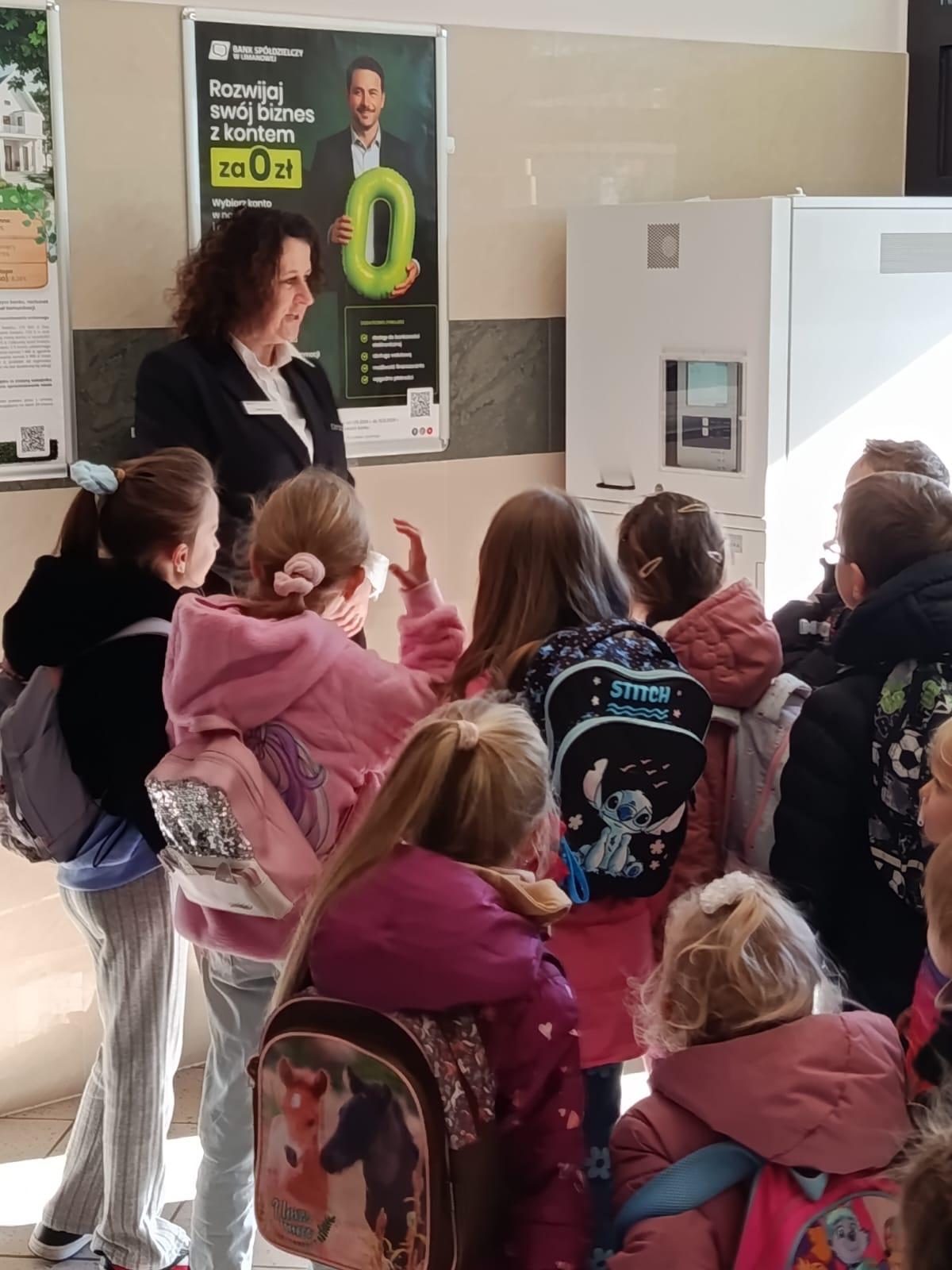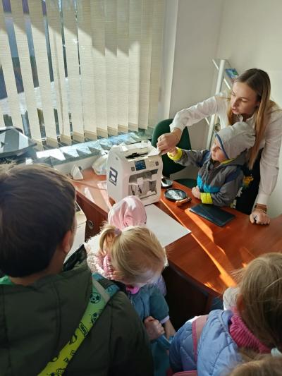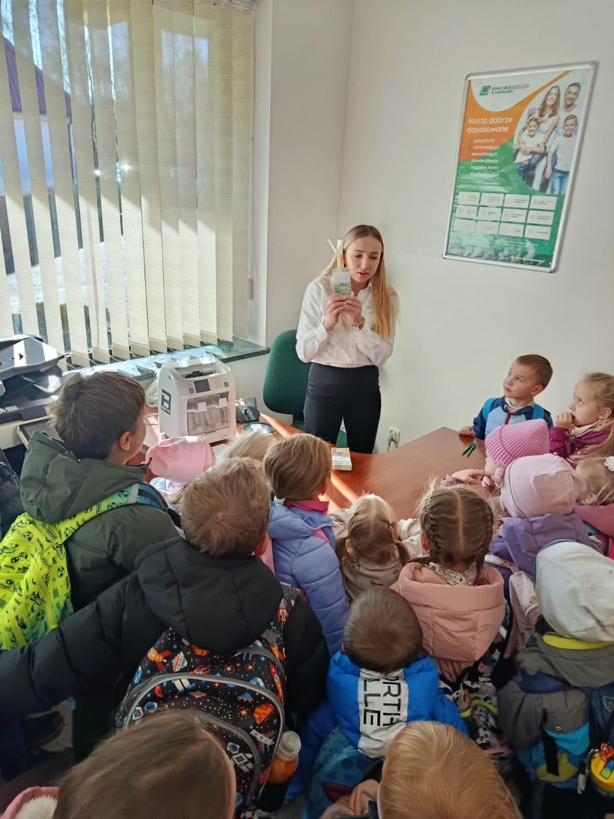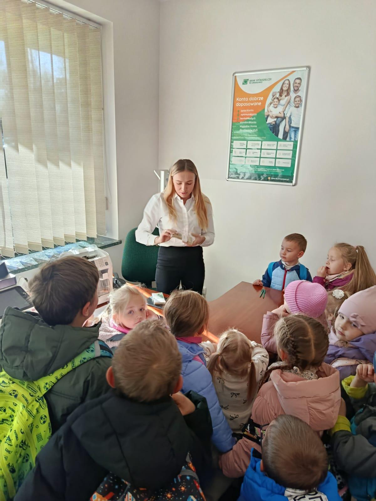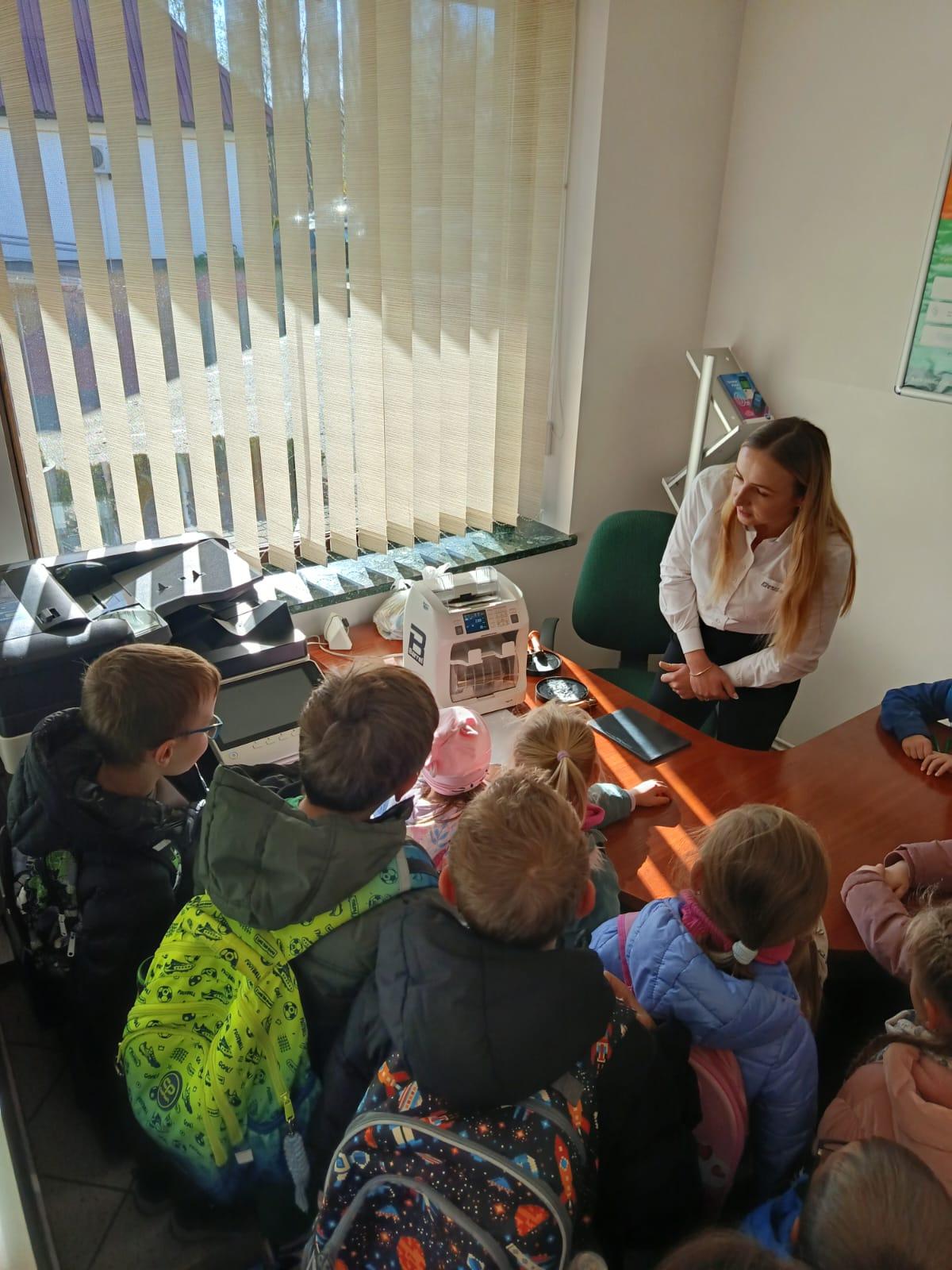 W środę 5 listopada 2025 r. przedszkolaki z oddziału przedszkolnego i uczniowie klasy 1 i 2 wybrali się na ciekawą wycieczkę edukacyjną. Pierwszym punktem programu była wizyta w Banku Spółdzielczym, gdzie zostali serdecznie przyjęci przez pracujące tam panie. Pracownice oprowadziły dzieci po banku i opowiedziały o swojej pracy w banku. Dużym zainteresowaniem cieszył się pokaz liczarki do pieniędzy, dzięki której można było zobaczyć, jak szybko i sprawnie można policzyć dużą ilość banknotów.