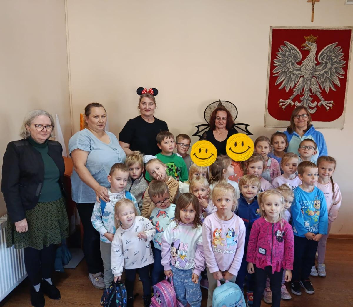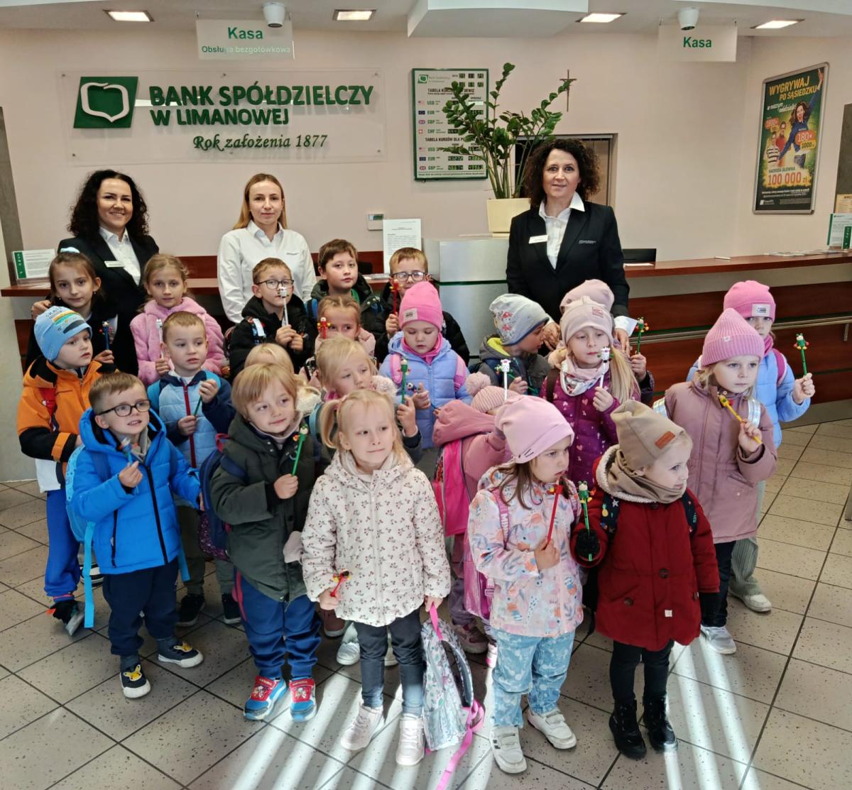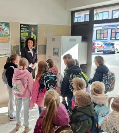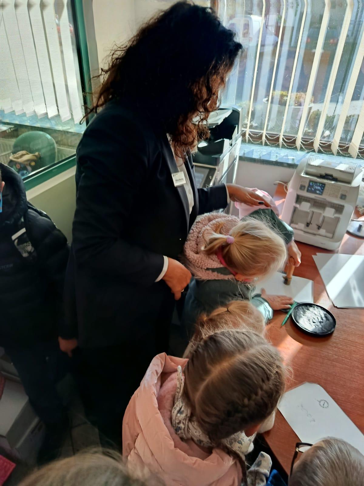 W środę 5 listopada 2025 r. przedszkolaki z oddziału przedszkolnego i uczniowie klasy 1 i 2 wybrali się na ciekawą wycieczkę edukacyjną. Pierwszym punktem programu była wizyta w Banku Spółdzielczym, gdzie zostali serdecznie przyjęci przez pracujące tam panie. Pracownice oprowadziły dzieci po banku i opowiedziały o swojej pracy w banku. Dużym zainteresowaniem cieszył się pokaz liczarki do pieniędzy, dzięki której można było zobaczyć, jak szybko i sprawnie można policzyć dużą ilość banknotów.
