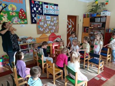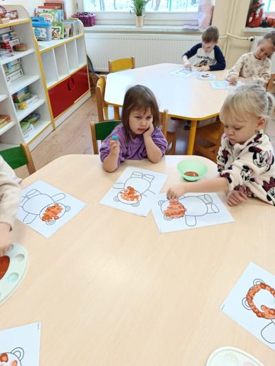 Dzień rozpoczęliśmy od wspólnych zabaw ruchowych z misiami. Dzieci biegały, maszerowały i wykonywały zadania ruchowe, z radością włączając swoje pluszaki do aktywności. Następnie przedszkolaki śpiewały piosenki o misiach, tworząc radosną, pełną ciepła atmosferę. Nie zabrakło również okazji do przytulania swoich misiów oraz wspólnego tańca, który sprawił wszystkim dużo uśmiechu.