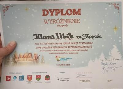 Z ogromna radością informujemy, że Klara Ubik 16 grudnia 2025 r. wzięła udział w konkursie kolęd ,,Gore gwiazda Jezuskowi w przedszkolach dziś" w kategorii solista.