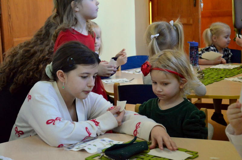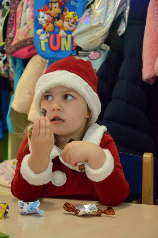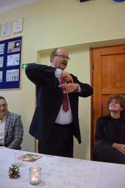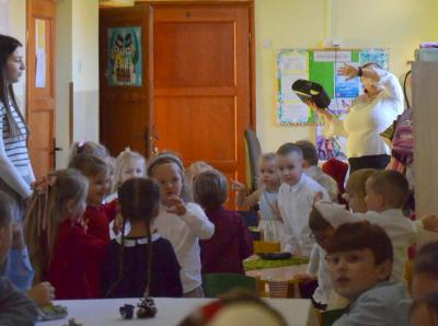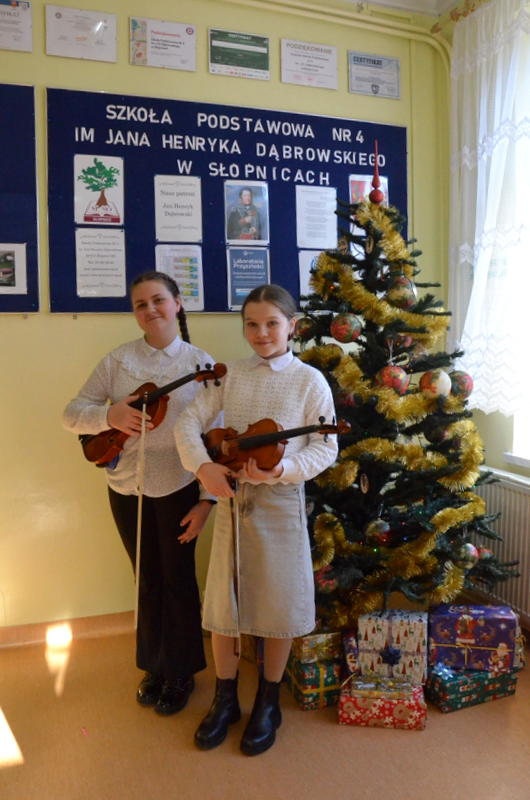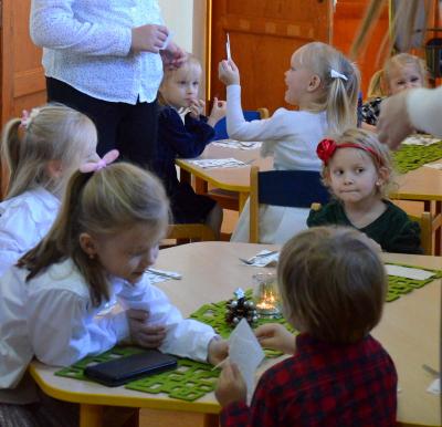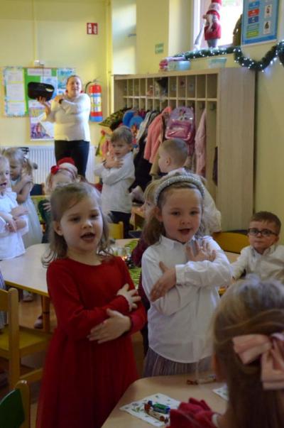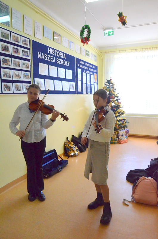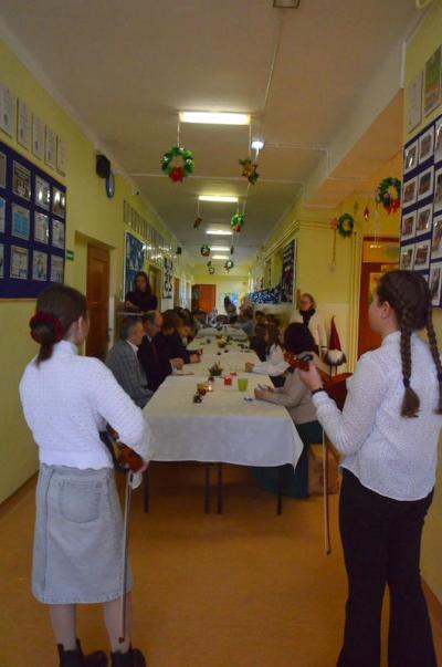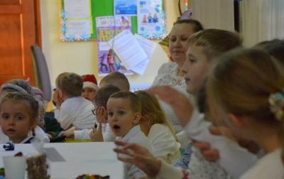 Po wspólnym obiedzie rozbrzmiały kolędy – śpiewane przy akompaniamencie skrzypiec Weroniki Florek i Wiktorii Gaury. Radość wszystkim sprawił występ przedszkolaków, które przedstawiły świąteczną piosenkę „Gwiazda drogę nam wskazuje” a pan Adam przypomniał piękną pastorałkę „Wołek i osiołek”, która wprowadziła wszystkich w prawdziwie bożonarodzeniowy nastrój.