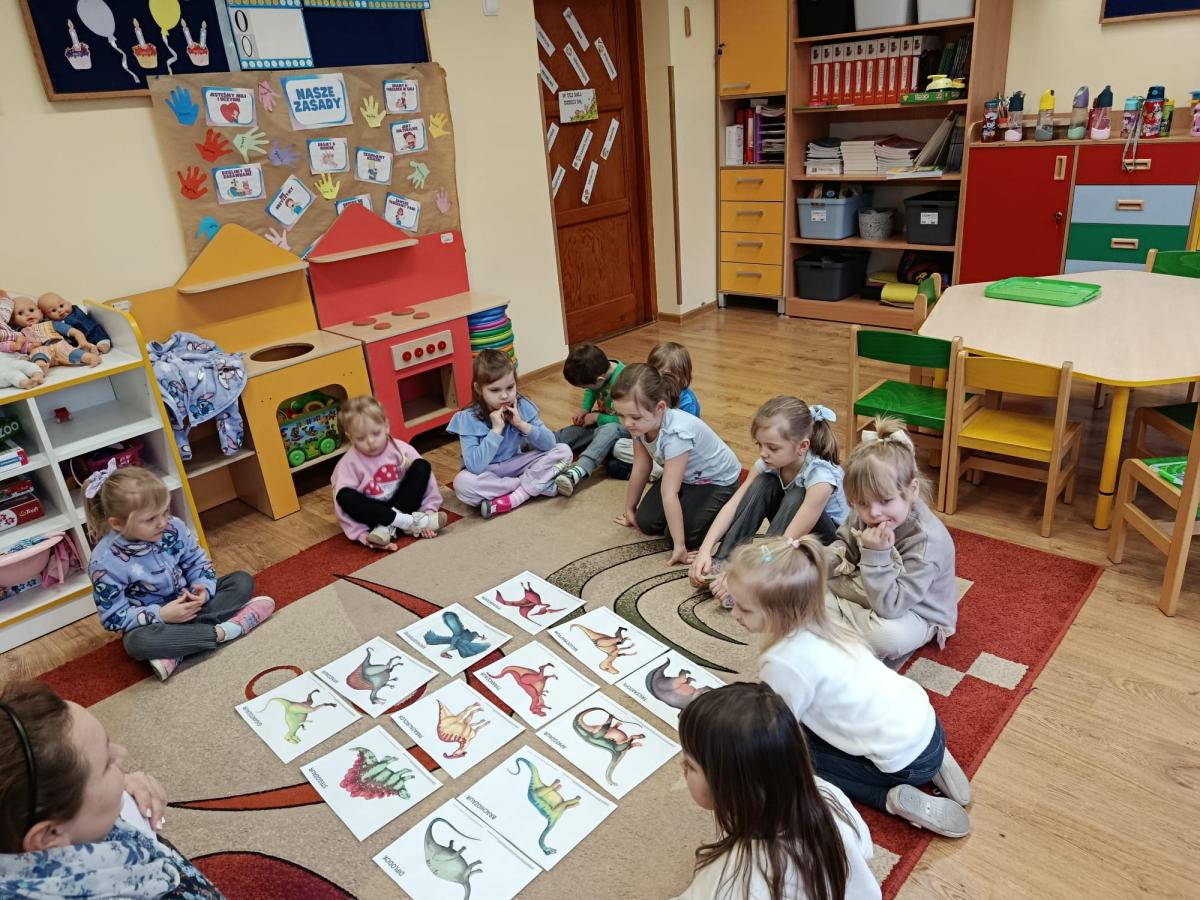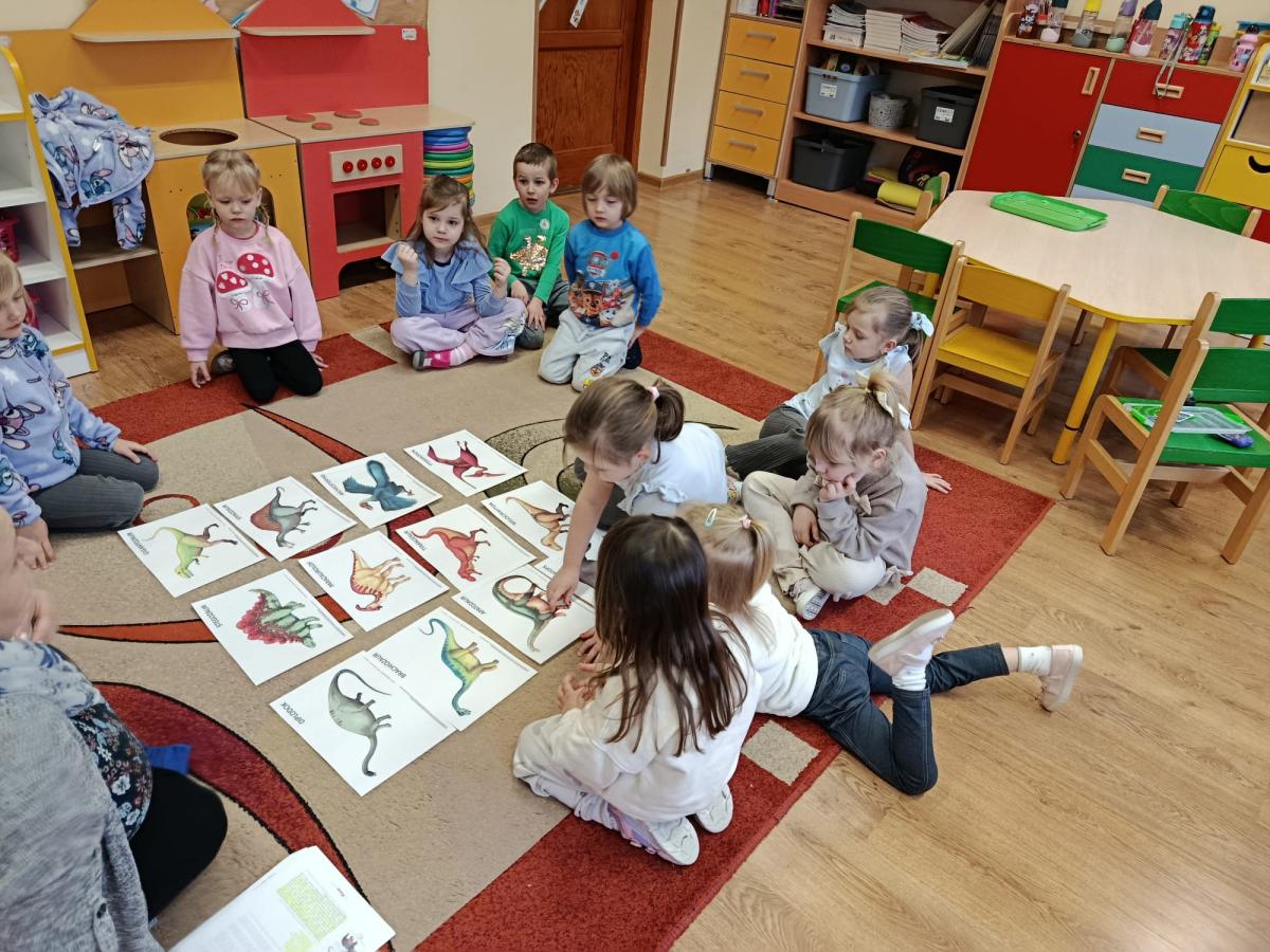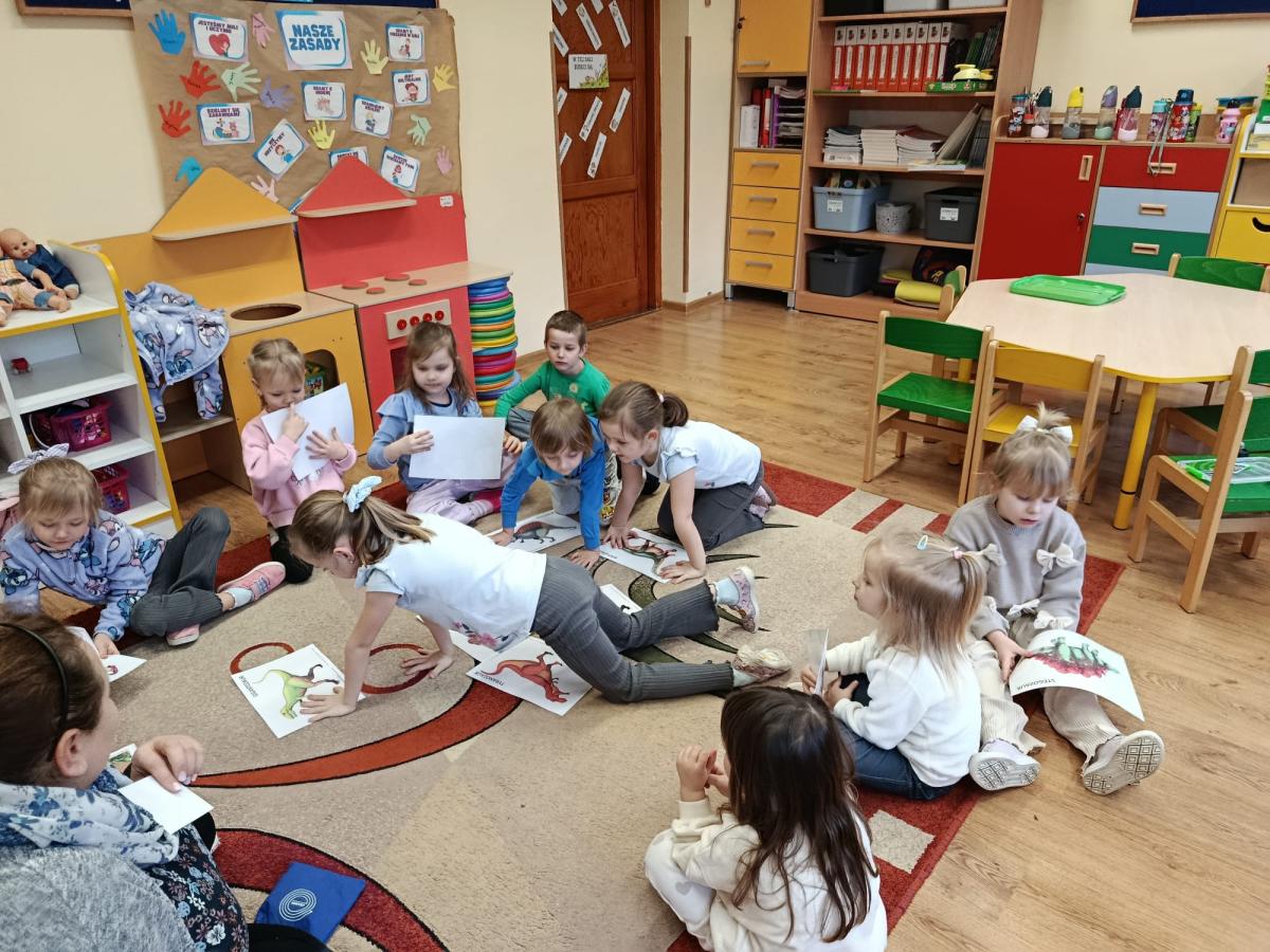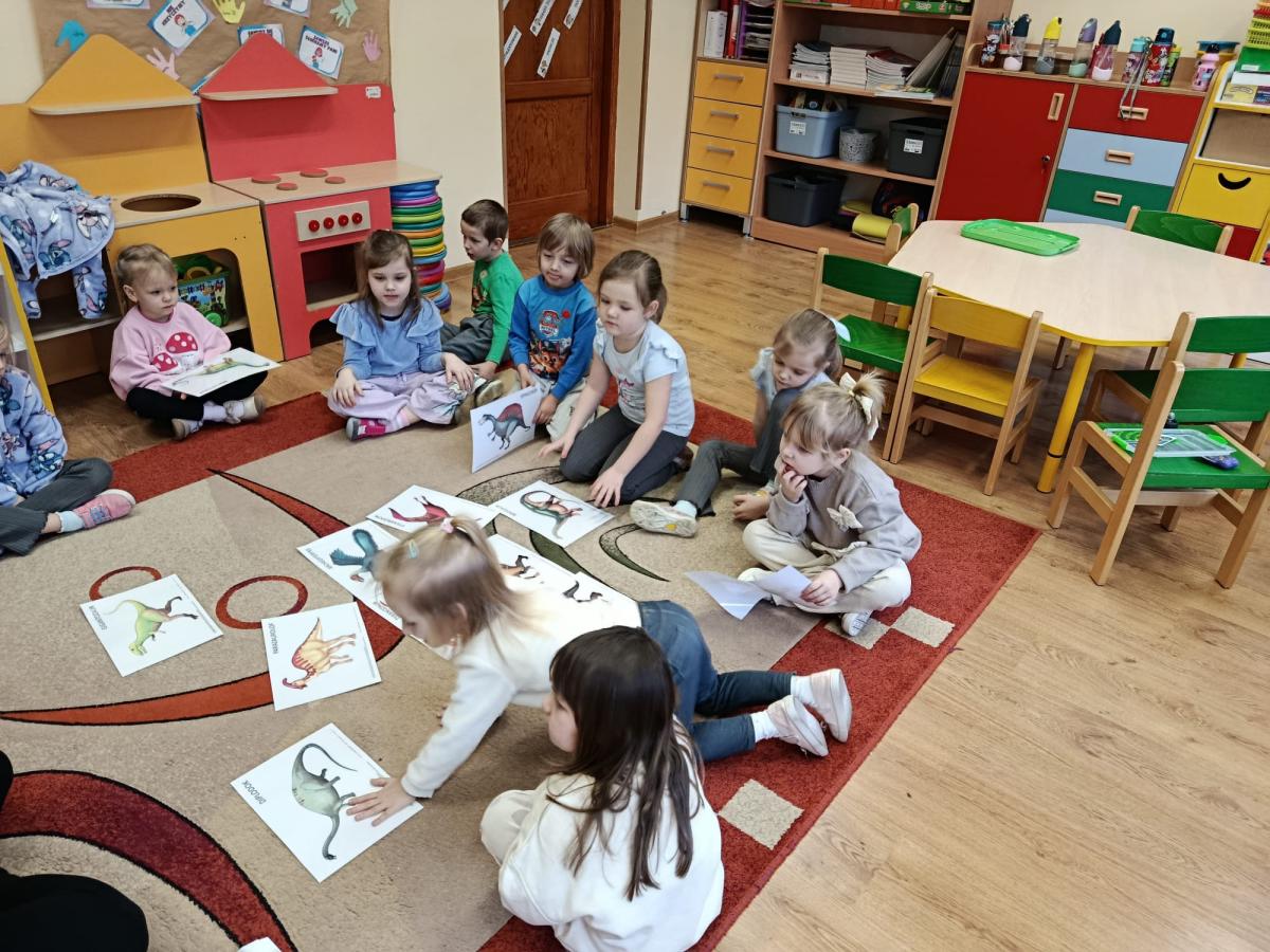 Dowiedziały się również, na czym polega praca paleontologa – jak odnajduje i bada skamieniałości oraz w jaki sposób odtwarza wygląd dinozaurów sprzed milionów lat. Podczas zajęć uczniowie dopasowywali szkielety do odpowiednich dinozaurów, rozwijając przy tym spostrzegawczość i logiczne myślenie. Wykonali także kreatywne prace plastyczne inspirowane światem prehistorii. Nie zabrakło zabaw ruchowych, tematycznych quizów oraz wspólnej nauki poprzez zabawę.