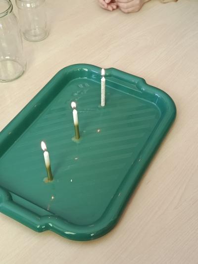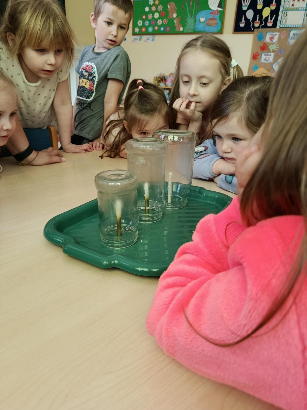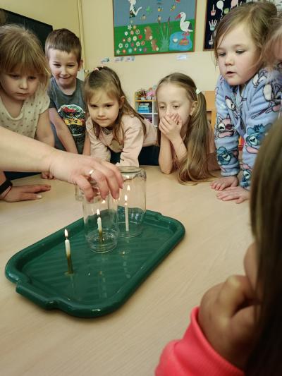 Przy omawianiu ognia przeprowadziliśmy bezpieczny eksperyment ze świeczkami. Dzieci obserwowały, jak długo palą się świeczki w różnych warunkach oraz co wpływa na długość palenia. Dzięki temu dowiedziały się, jak ważny jest dostęp powietrza oraz jak należy zachować szczególną ostrożność w kontakcie z ogniem.
