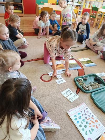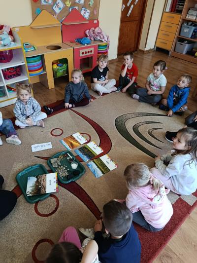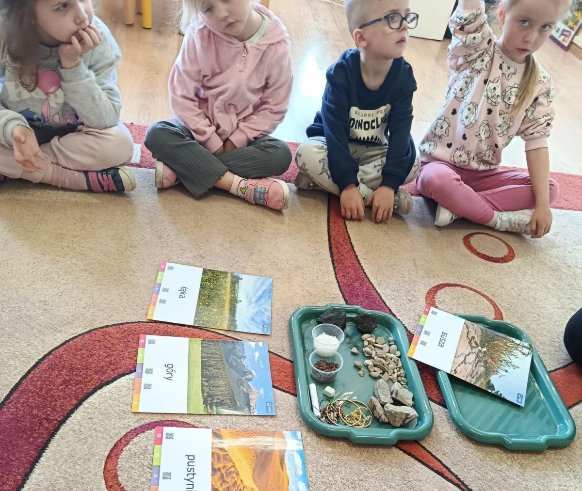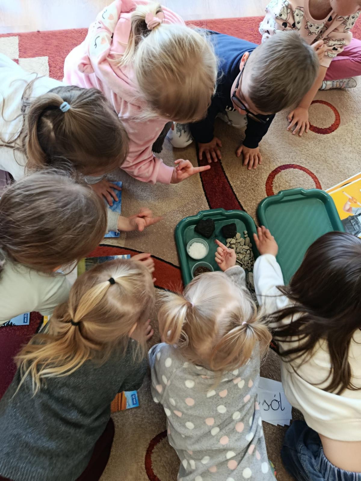 Podczas zajęć o ziemi dzieci poznawały jej „skarby”. Miały okazję zobaczyć i dotknąć różnych materiałów, takich jak węgiel kamienny, kryształki soli, piasek, kamienie czy glebę. Rozmawialiśmy o tym, co daje nam ziemia – rośliny, pożywienie oraz miejsce do życia – i dlaczego należy o nią dbać.