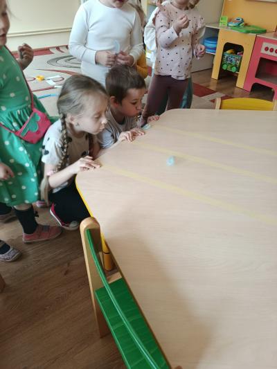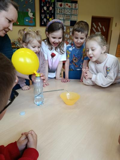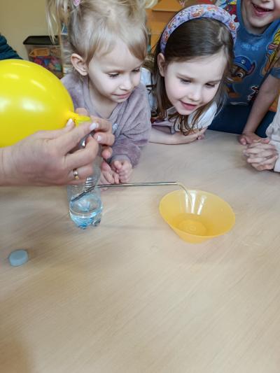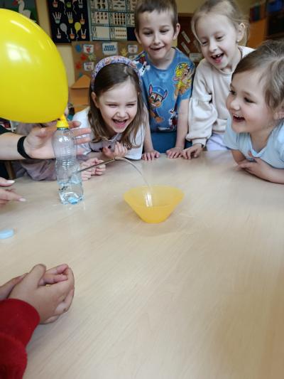 Podczas zajęć dotyczących wody dzieci wzięły udział w eksperymencie z wykorzystaniem balonu. Obserwowały, jak woda zachowuje się pod wpływem powietrza, co pozwoliło im lepiej zrozumieć, że oba żywioły mogą na siebie oddziaływać. Było to dla przedszkolaków niezwykle ciekawe doświadczenie, które wzbudziło wiele pytań i radości.