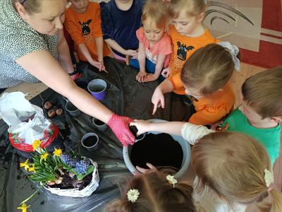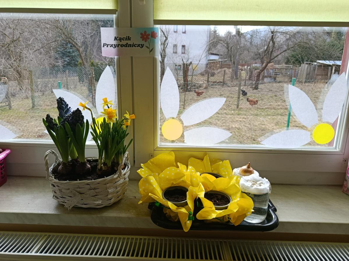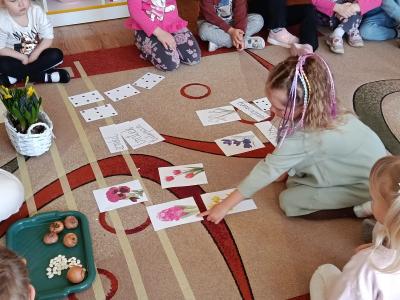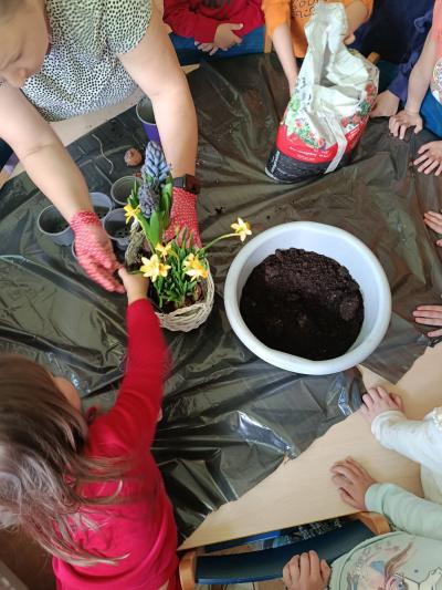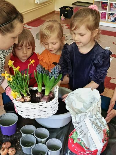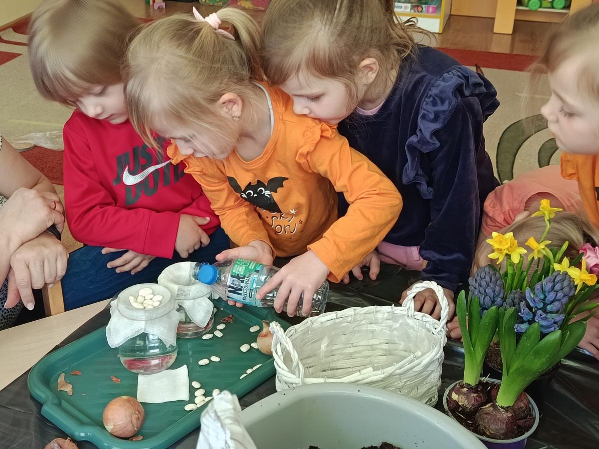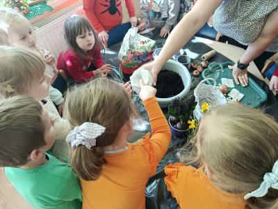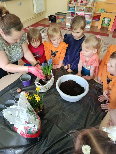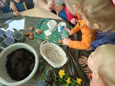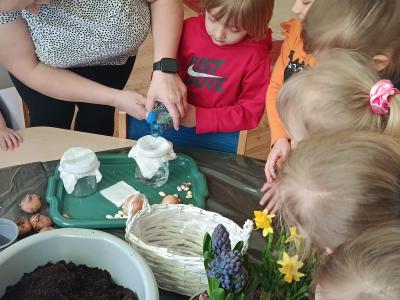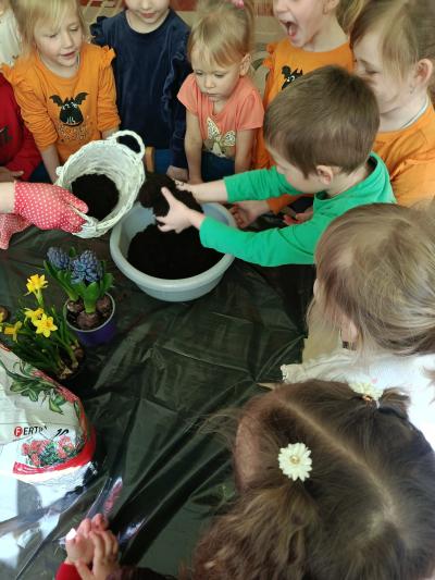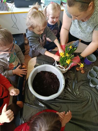 Dzieci założyły hodowlę grochu i cebuli na wilgotnej gazie, obserwując proces kiełkowania . Sadziły również cebulki kwiatowe w doniczkach. 23 marca obchodziliśmy w przedszkolu Pierwszy Dzień Wiosny. Był to czas wspólnej zabawy, piosenek, zagadek oraz ciekawych zadań matematycznych. Na zakończenie wybraliśmy się na spacer, szukając oznak budzącej się do życia przyrody.
