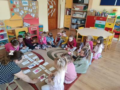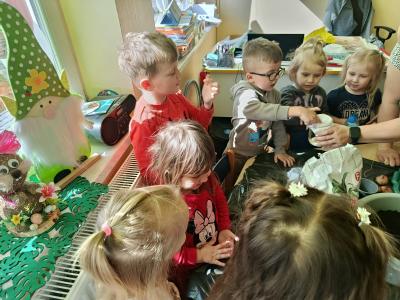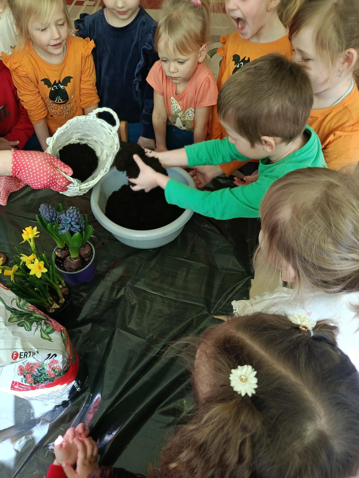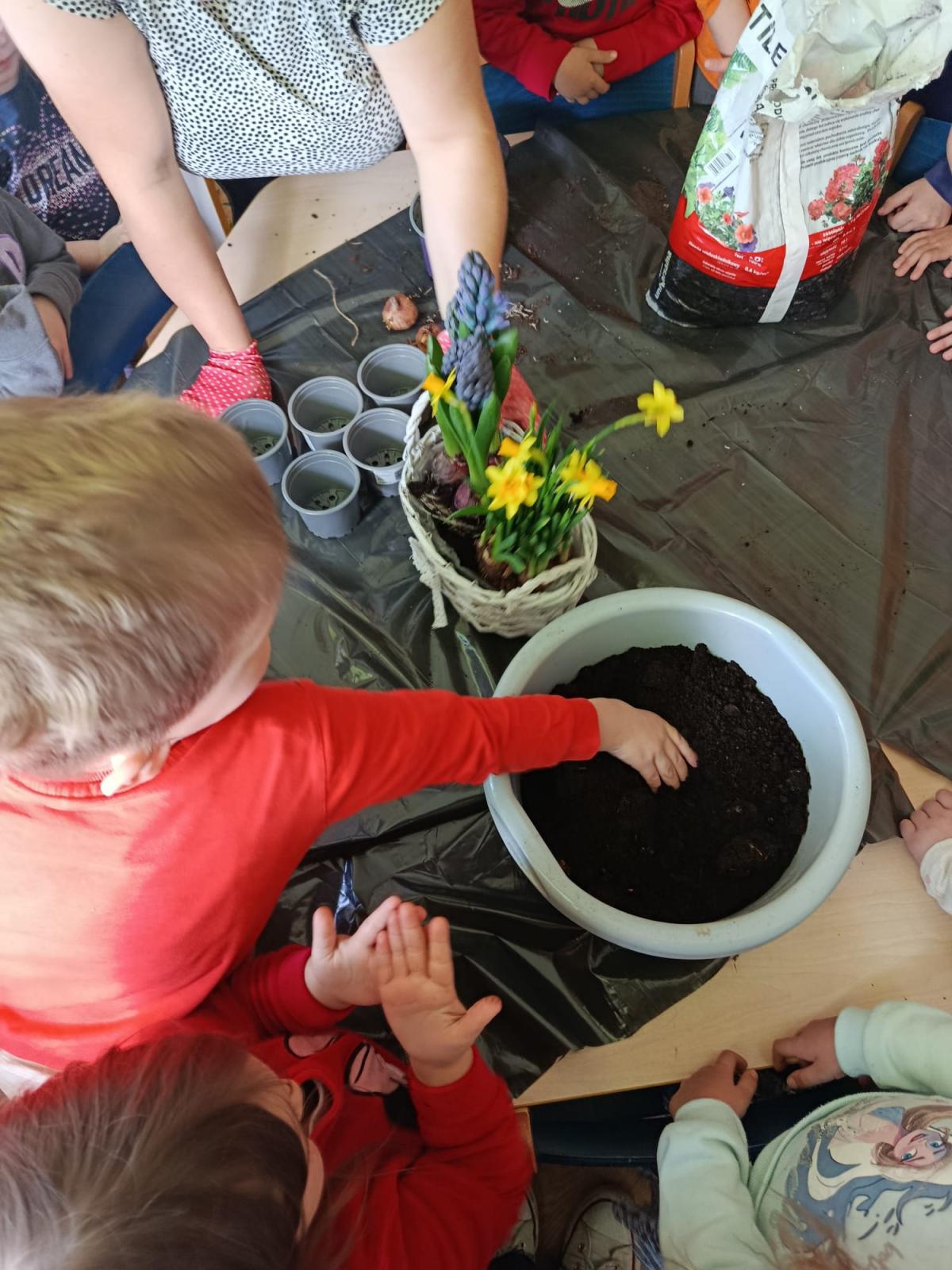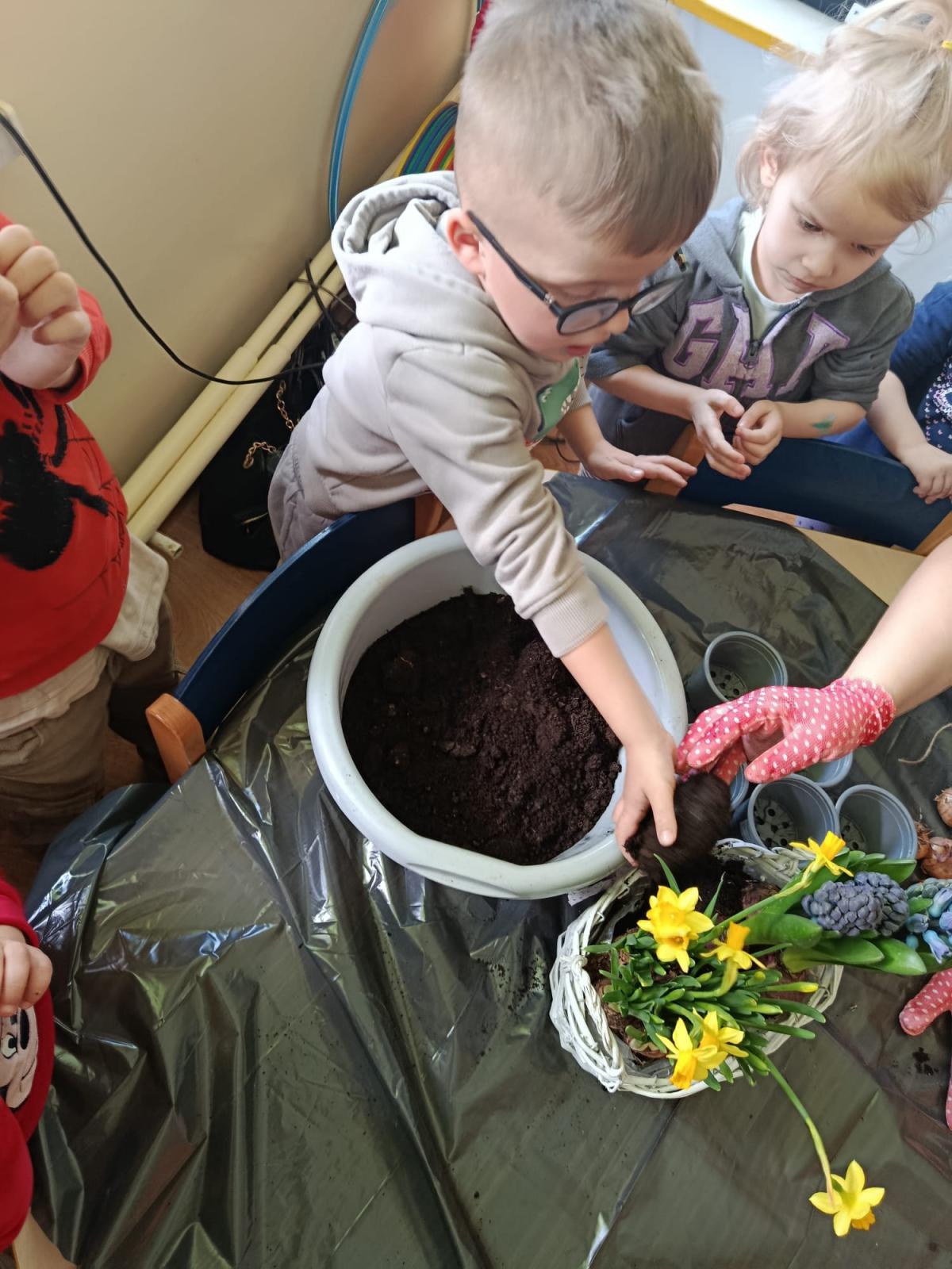 Dzieci założyły hodowlę grochu i cebuli na wilgotnej gazie, obserwując proces kiełkowania . Sadziły również cebulki kwiatowe w doniczkach. 23 marca obchodziliśmy w przedszkolu Pierwszy Dzień Wiosny. Był to czas wspólnej zabawy, piosenek, zagadek oraz ciekawych zadań matematycznych. Na zakończenie wybraliśmy się na spacer, szukając oznak budzącej się do życia przyrody.