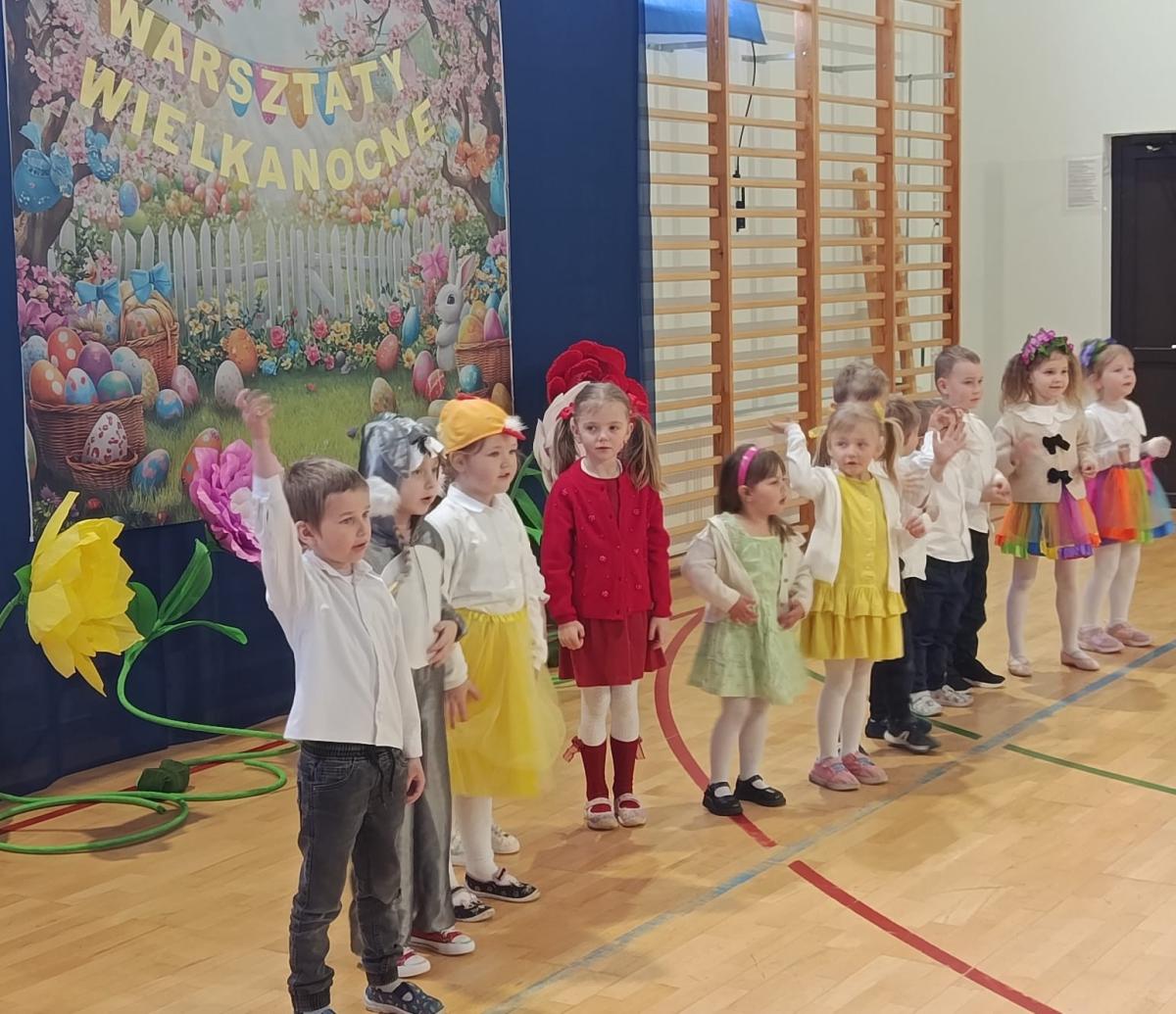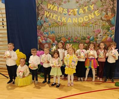 27 marca 2026 r. w naszej szkole odbyły się wyjątkowe warsztaty wielkanocne z udziałem przedszkolaków oraz ich rodziców. Spotkanie rozpoczęło się krótkim przedstawieniem przygotowanym przez dzieci. Na scenie pojawił się wesoły króliczek, kurki oraz kolorowe pisanki, które w ciekawy sposób przypomniały wszystkim, co powinno znaleźć się w koszyczku wielkanocnym.