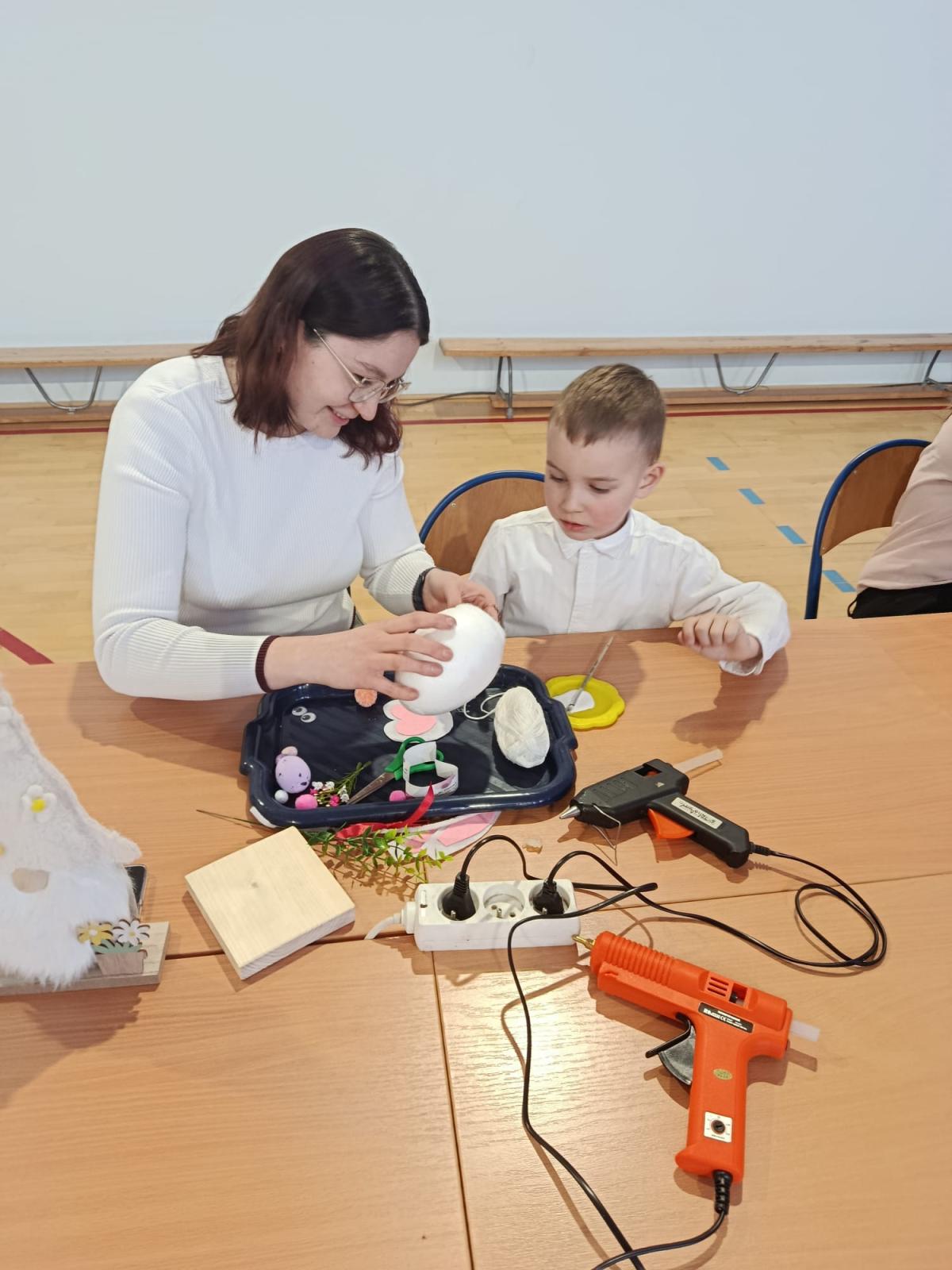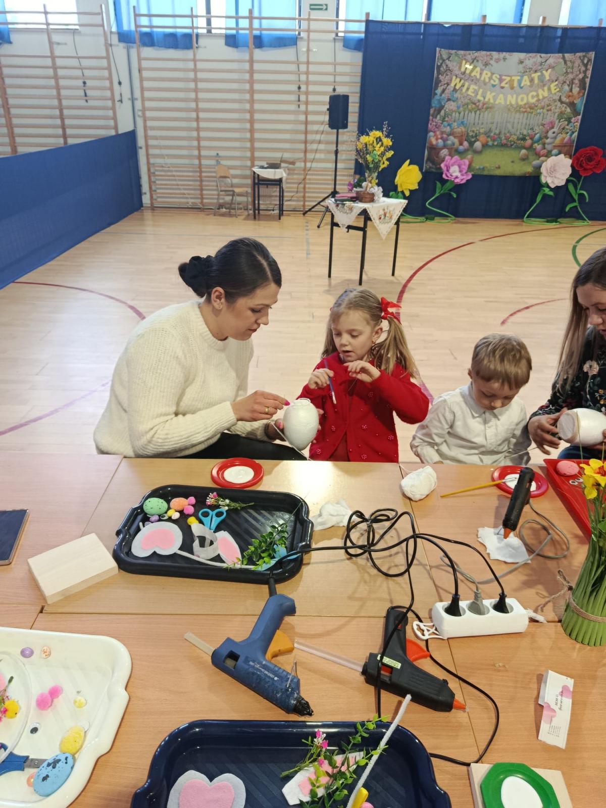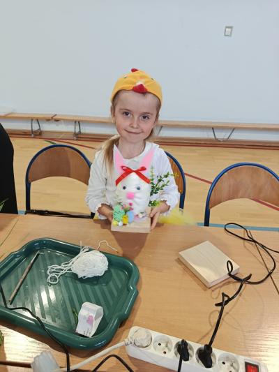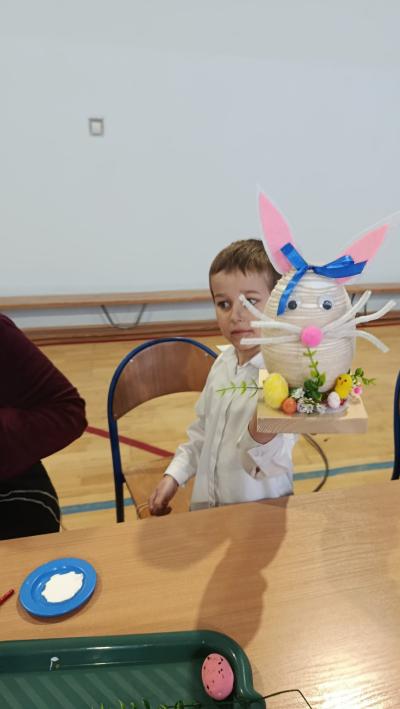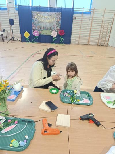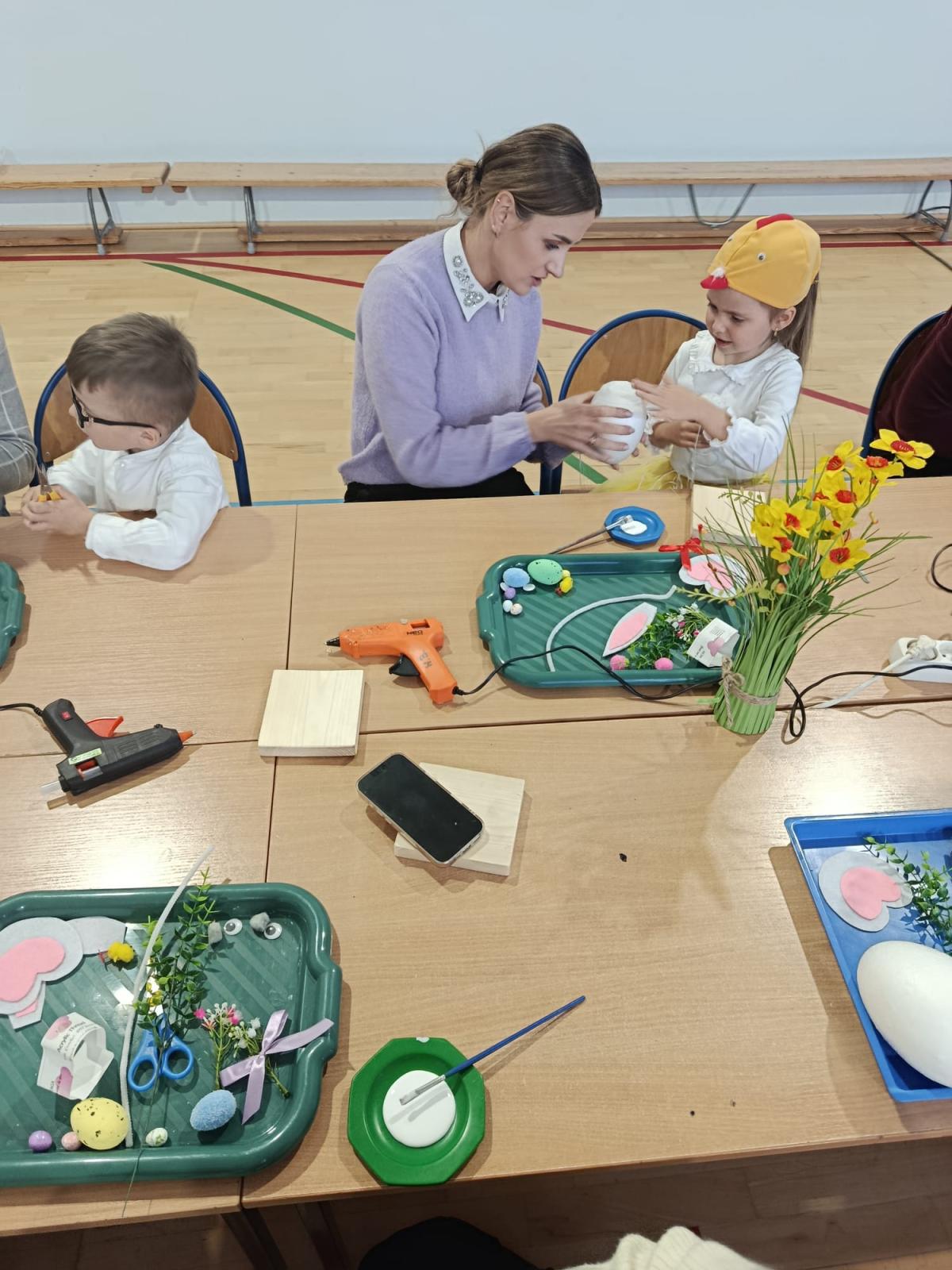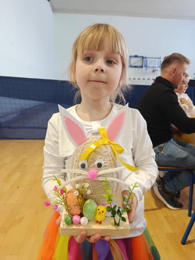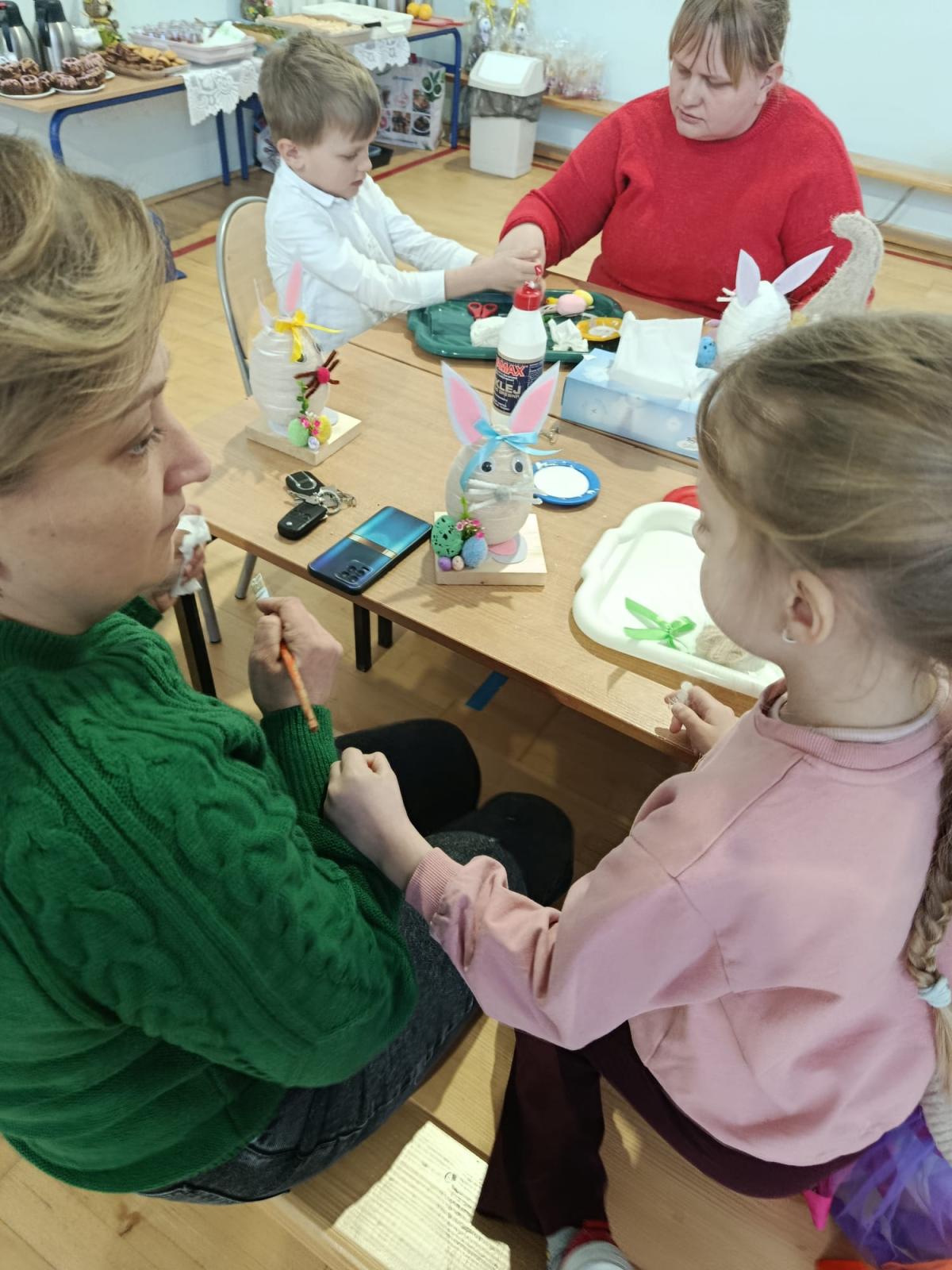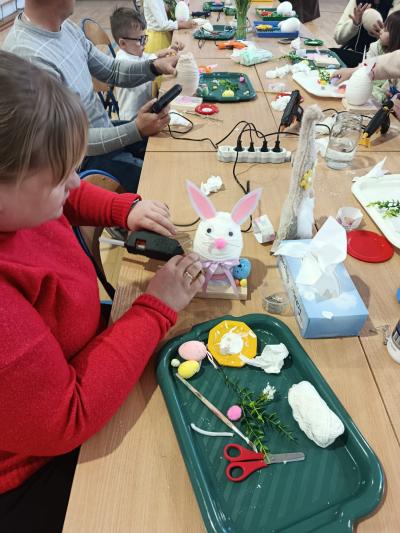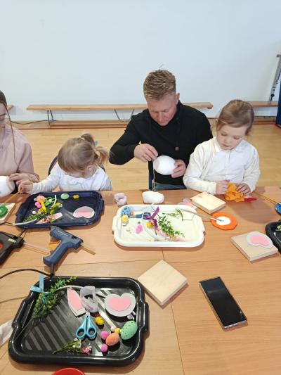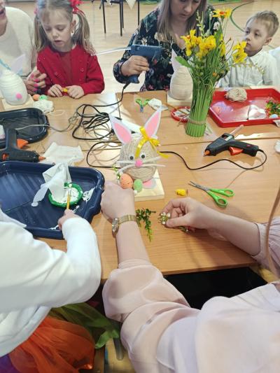Po części artystycznej uczestnicy przystąpili do wspólnej pracy twórczej. Dzieci wraz z rodzicami wykonywały wielkanocne zajączki z jajek styropianowych i włóczki. Była to doskonała okazja do rozwijania kreatywności oraz spędzenia czasu w miłej, rodzinnej atmosferze.