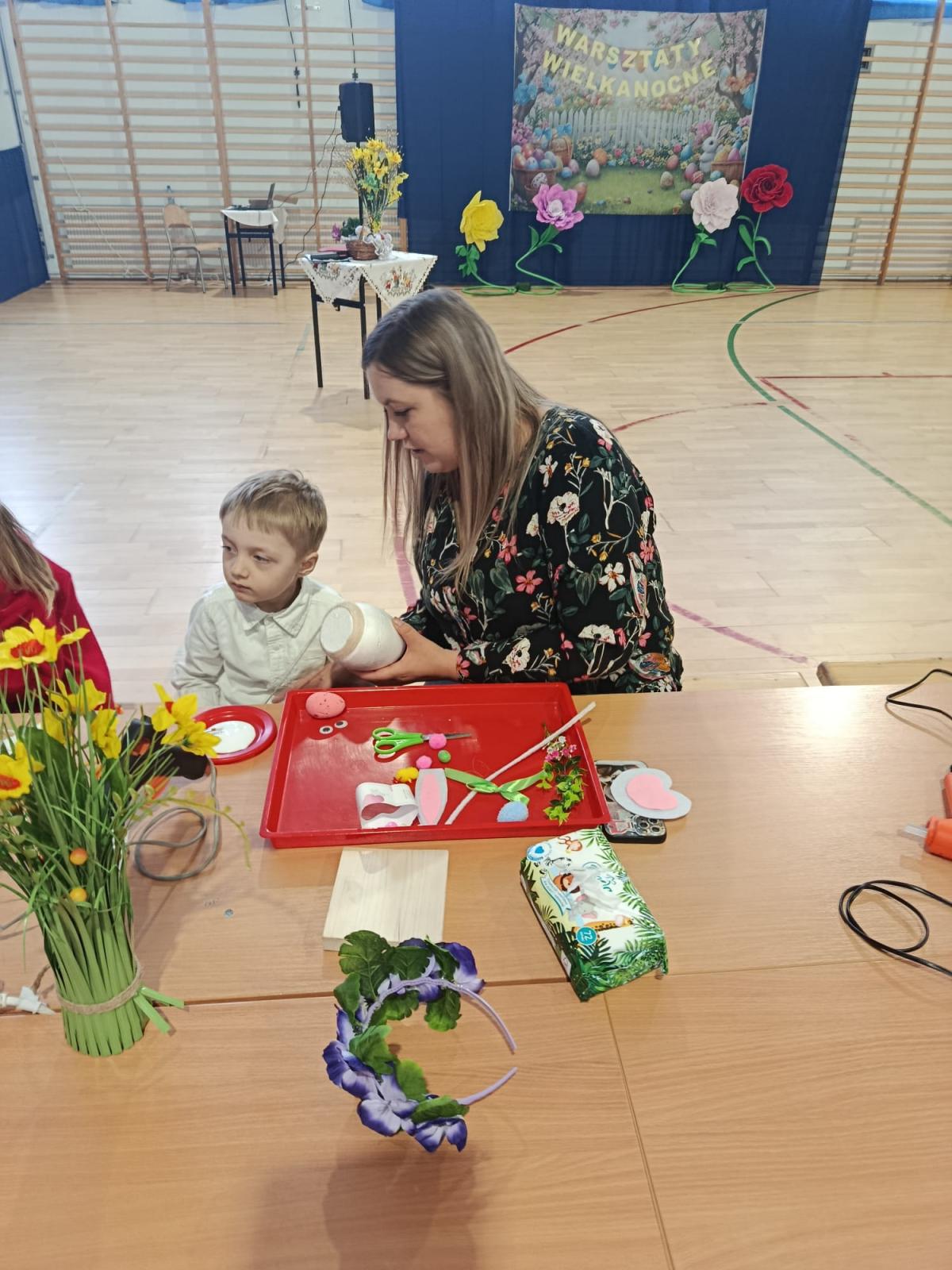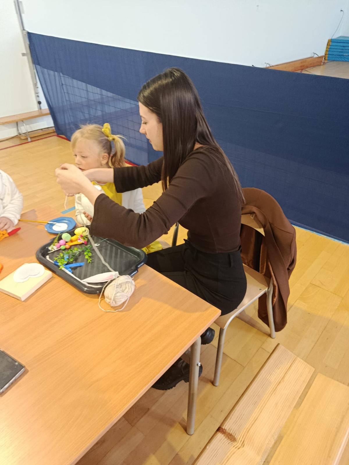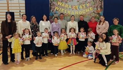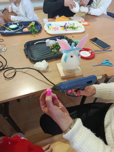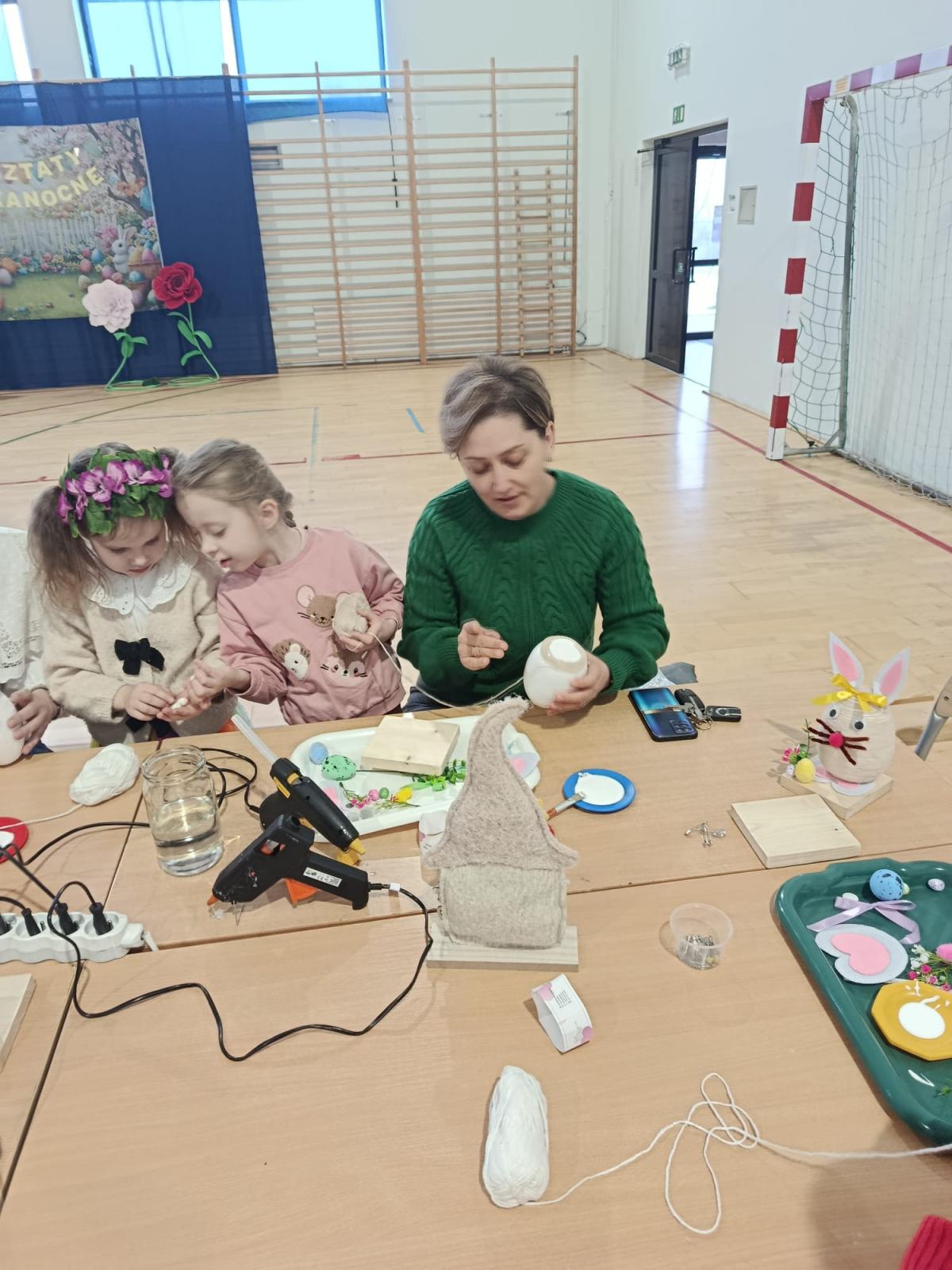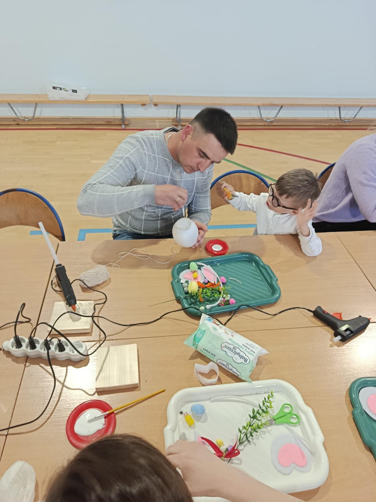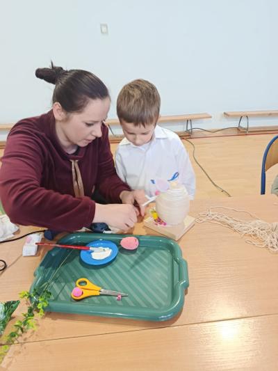 Po części artystycznej uczestnicy przystąpili do wspólnej pracy twórczej. Dzieci wraz z rodzicami wykonywały wielkanocne zajączki z jajek styropianowych i włóczki. Była to doskonała okazja do rozwijania kreatywności oraz spędzenia czasu w miłej, rodzinnej atmosferze.